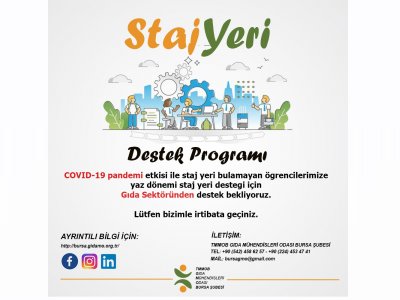 TMMOB Gıda Mühendisleri Odası Bursa Şubesi tarafından hayata geçirilen `Staj Destek Programı`` Bursa Uludağ Üniversitesi ve Bursa Teknik Üniversitesi Gıda Mühendisliği Bölümü öğrencilerimizin zorunlu Temmuz Eylül ayları arasındaki yaz dönemi staj yeri bulmalarına destek olmak amacıyla başlatılmıştır.