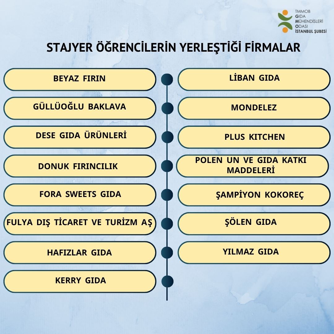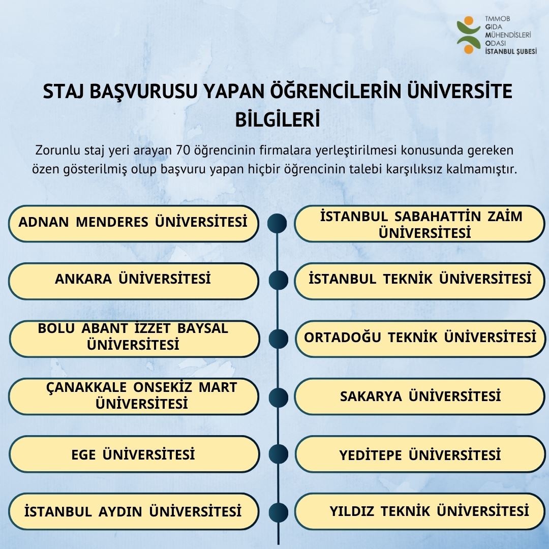 TMMOB Gıda Mühendisleri Odası İstanbul Şubesi olarak, 2024 yaz dönemi staj yeri sağlama programı tamamlanmış olup 12 farklı üniversiteden 70 öğrencimize staj imkanı sağlanmıştır.