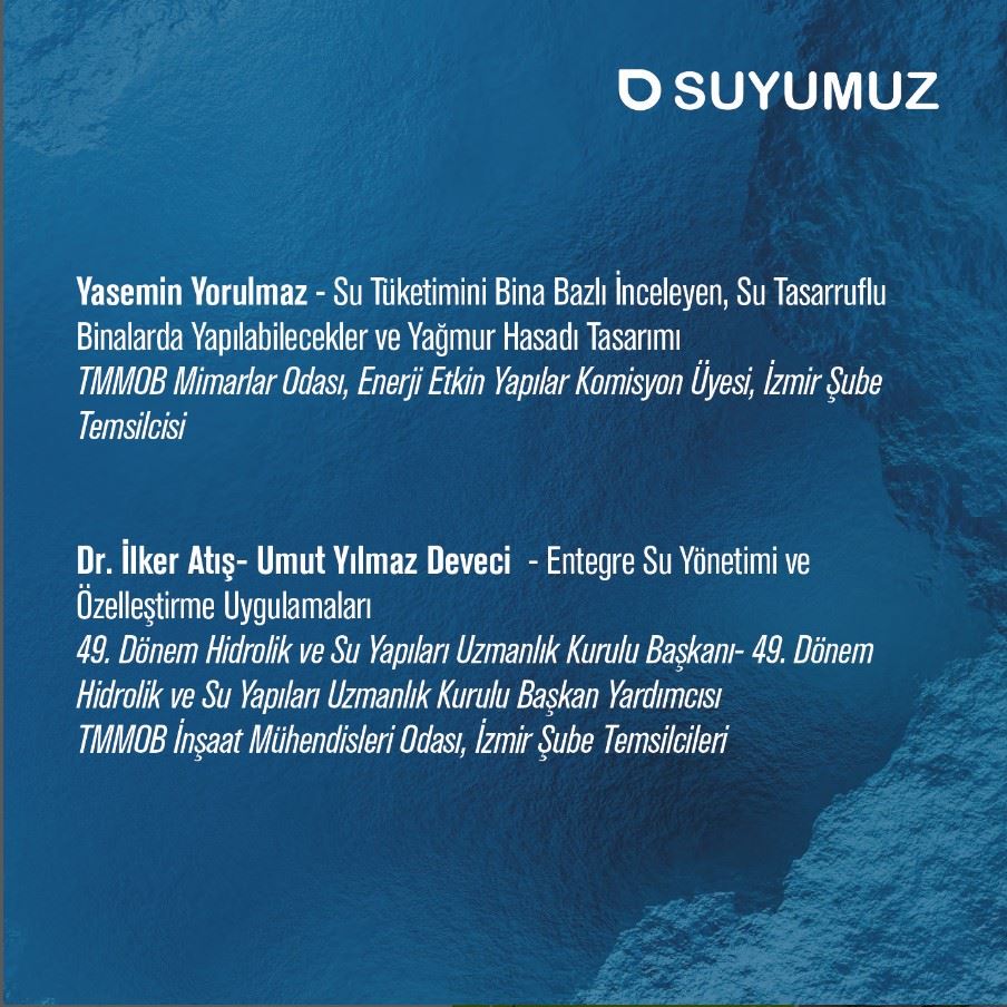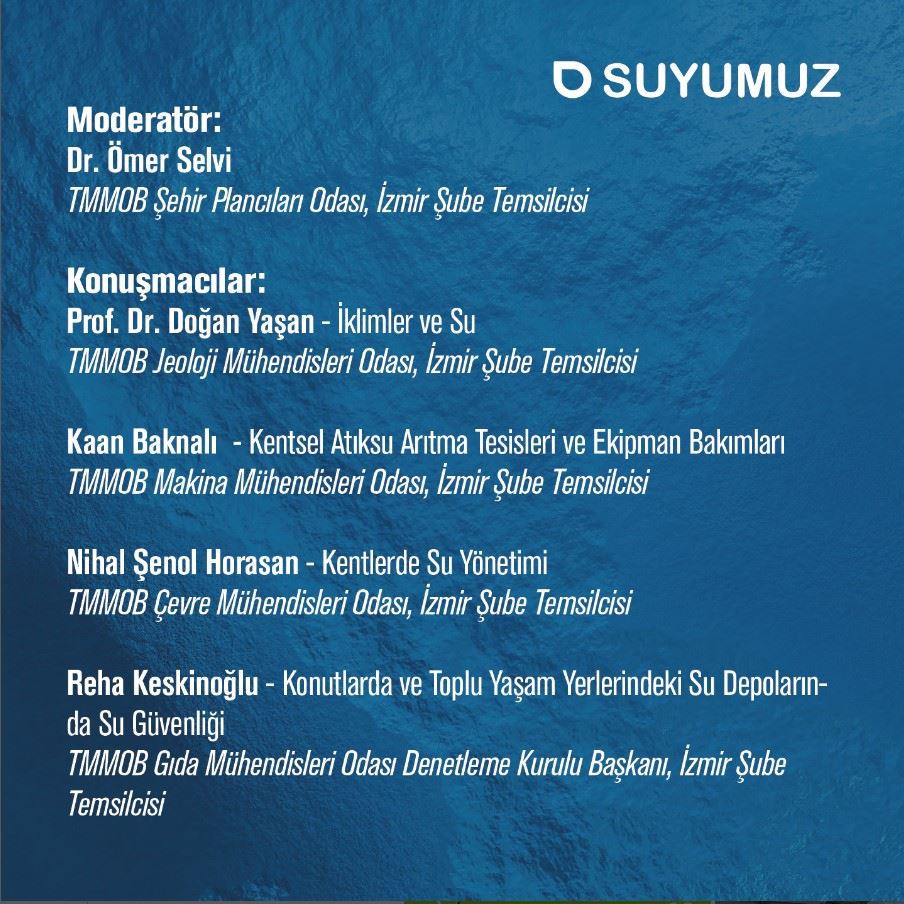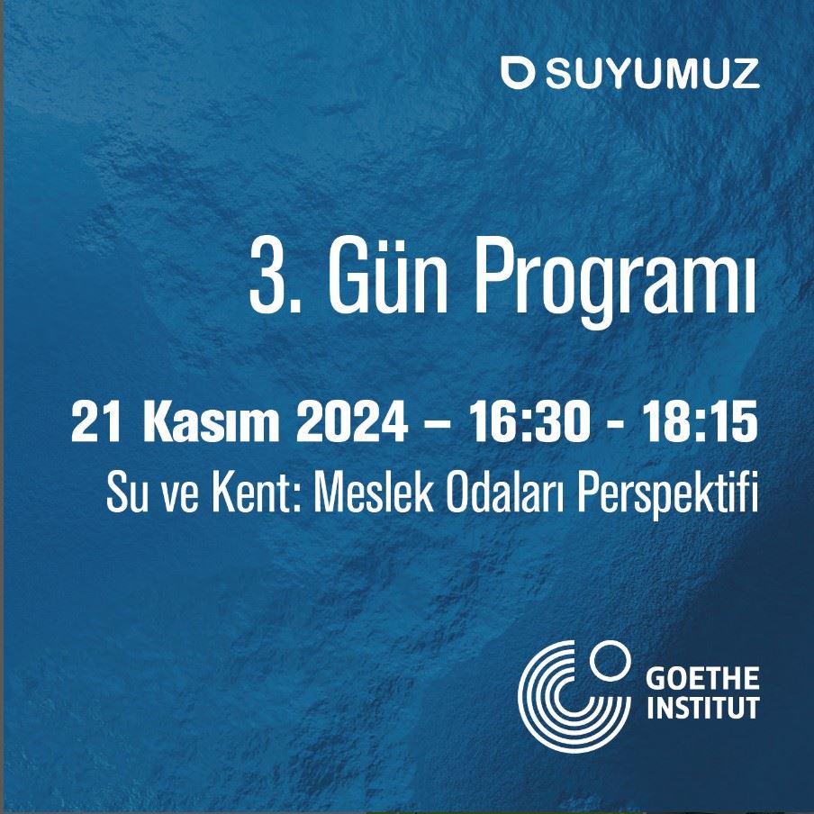 Goethe-Institut İzmir'in bu yıl ikincisini düzenlediği, gezegenimizin geleceği için suyun önemini tartışmak üzere İzmir'den genele odaklanmanın amaçlandığı "Suyumuz - İzmir Su Günleri" konuşma serisinin 3. gün oturumlarında yer alacağız. İklim değişikliği, kentsel atıksu arıtma tesisleri ve teknolojileri ile su kaynaklarının korunmasına dair uygulamaların tartışılacağı "Su ve Kent: Meslek Odaları Perspektifi" başlıklı oturumda Şubemiz adına Oda Denetleme Kurulu Başkanımız Reha KESKİNOĞLU, “Konutlarda ve Toplu Yaşam Yerlerindeki Su Depolarında Su Güvenliği” başlıklı sunumuyla yer alacak.