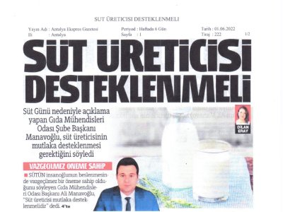 Antalya Ekspres Gazetesinde yayınlanan TMMOB Gıda Mühendisleri Odası 1 Haziran Dünya Süt Günü ortak basın açıklaması.