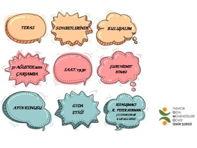 Tarih: 31 Ağustos 2022 Çarşamba Saat: 19.30 Yer: Şube Hizmet Binası Ayın Konusu: Gıda Etiği Konuşmacı: R. Petek ATAMAN (TMMOB Gıda Mühendisleri Odası Onur Kurulu Üyesi) |