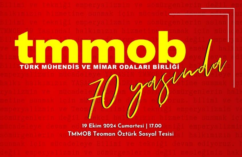 Türk Mühendis ve Mimar Odaları Birliği'nin 70. kuruluş yıl dönümü dolayısıyla 19 Ekim 2024 tarihinde Teoman Öztürk Sosyal Tesisi'nde 70. Yıl etkinliği düzenlenecektir.