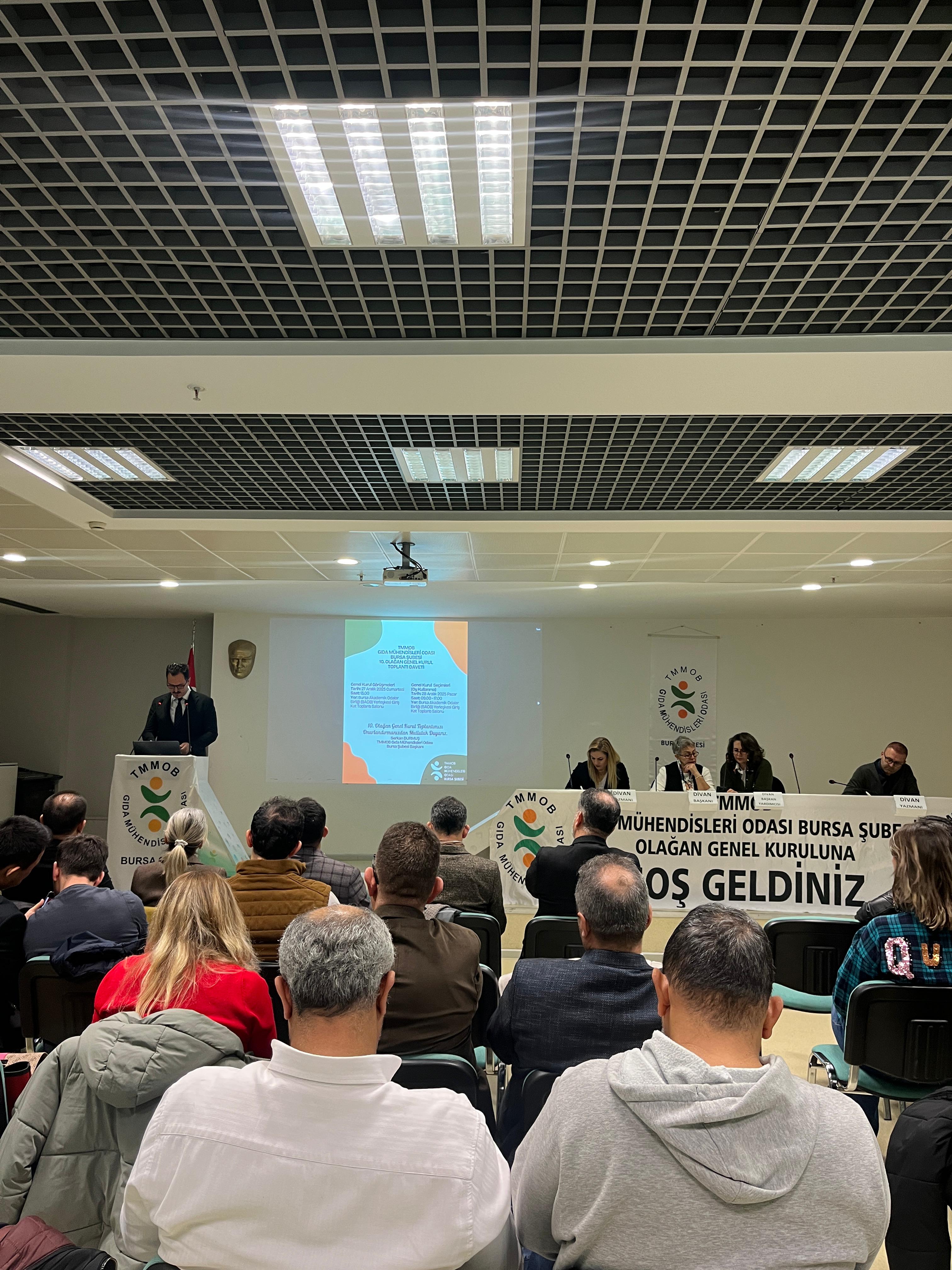 TMMOB Gıda Mühendisleri Odası Bursa Şubesi 10. Olağan Genel Kurul Görüşmeleri, 27 Aralık 2025 tarihinde Bursa Akademik Odalar Birliği Yerleşkesi (BAOB)’nde gerçekleştirildi. Saygı duruşu ve İstiklal Marşı’nın ardından Divan Kurulu oluşturularak görüşmelere başlandı. 9.Dönem Şube Yönetim Kurulu Başkanı Sayın Serkan DURMUŞ’un açılış konuşmaları ile devam etti.