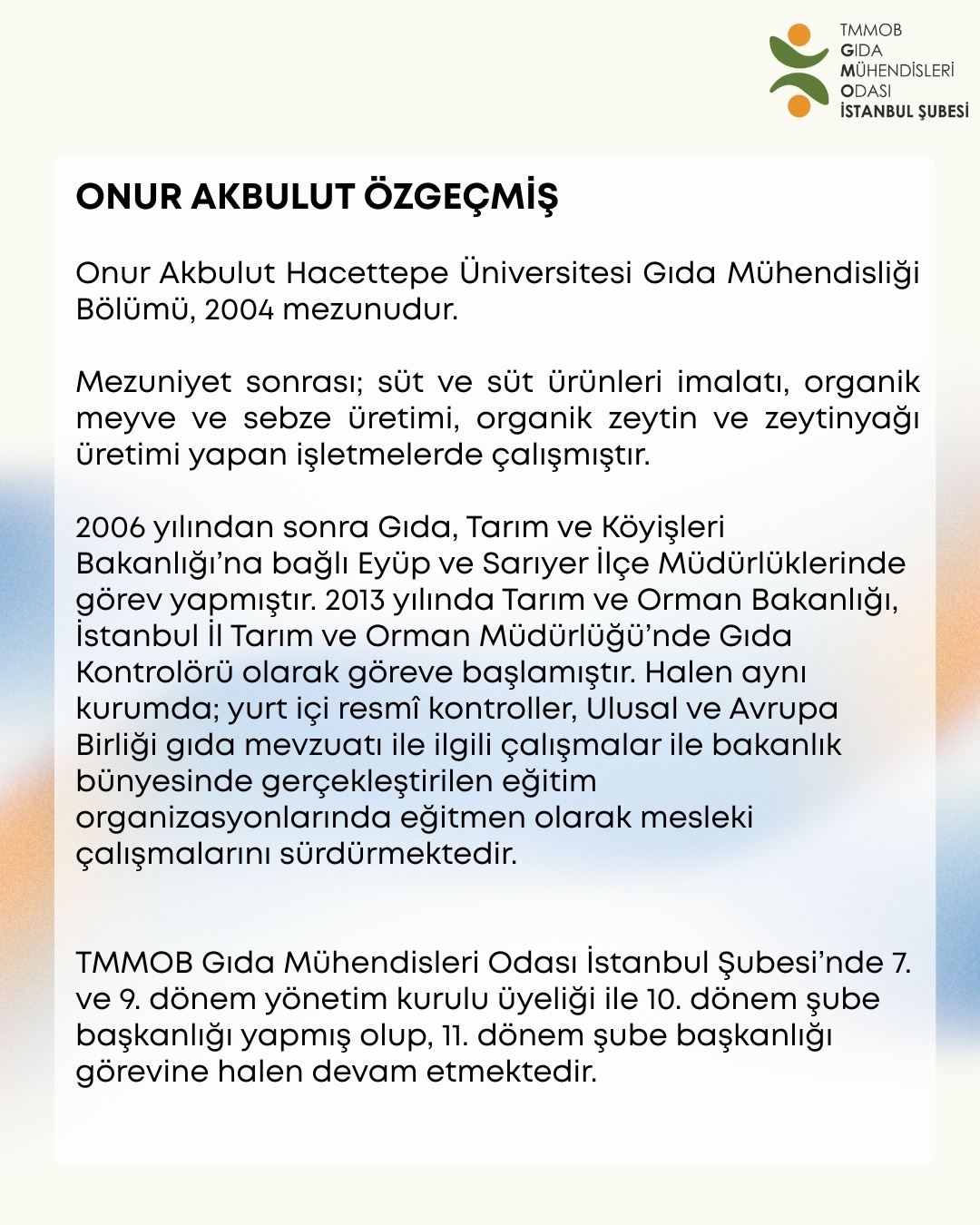 Gıda Yüksek Mühendisi Onur AKBULUT / TMMOB GıdaMO İstanbul Şube Yönetim Kurulu Başkanı - Tarım ve Orman Bakanlığı İstanbul İl Müdürlüğü
