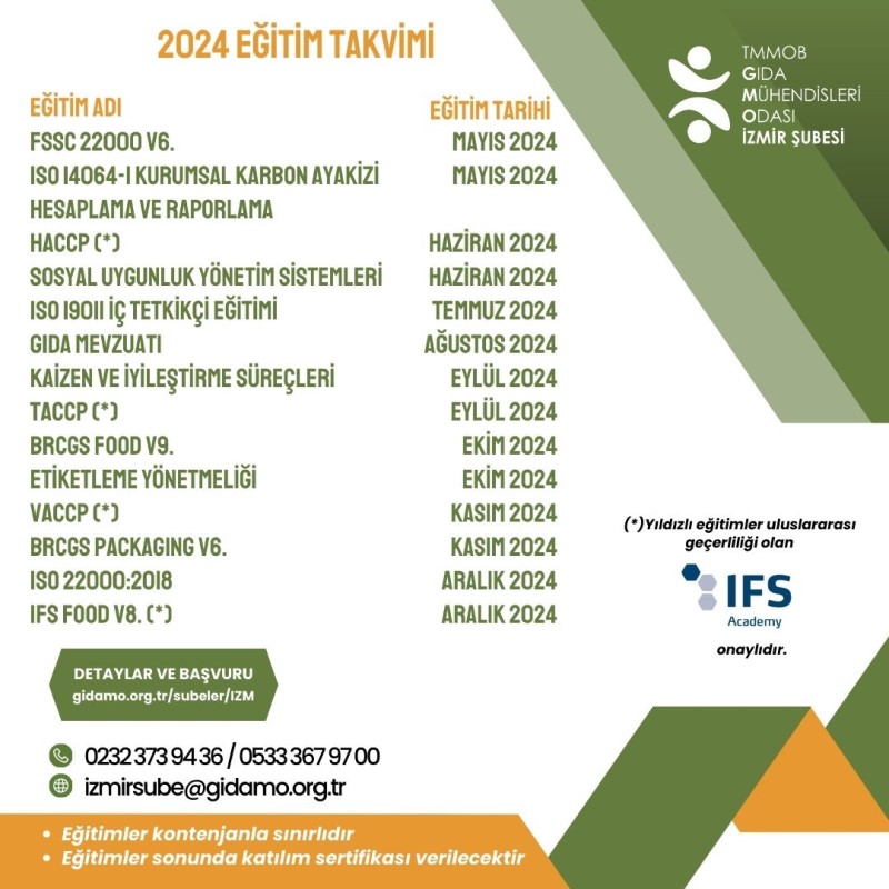 * Şubemizin yeni dönem eğitimleri 11-12 Mayıs 2024 tarihlerinde düzenleyeceğimiz FSSC 22000 V6. Eğitimi ile başlıyor.