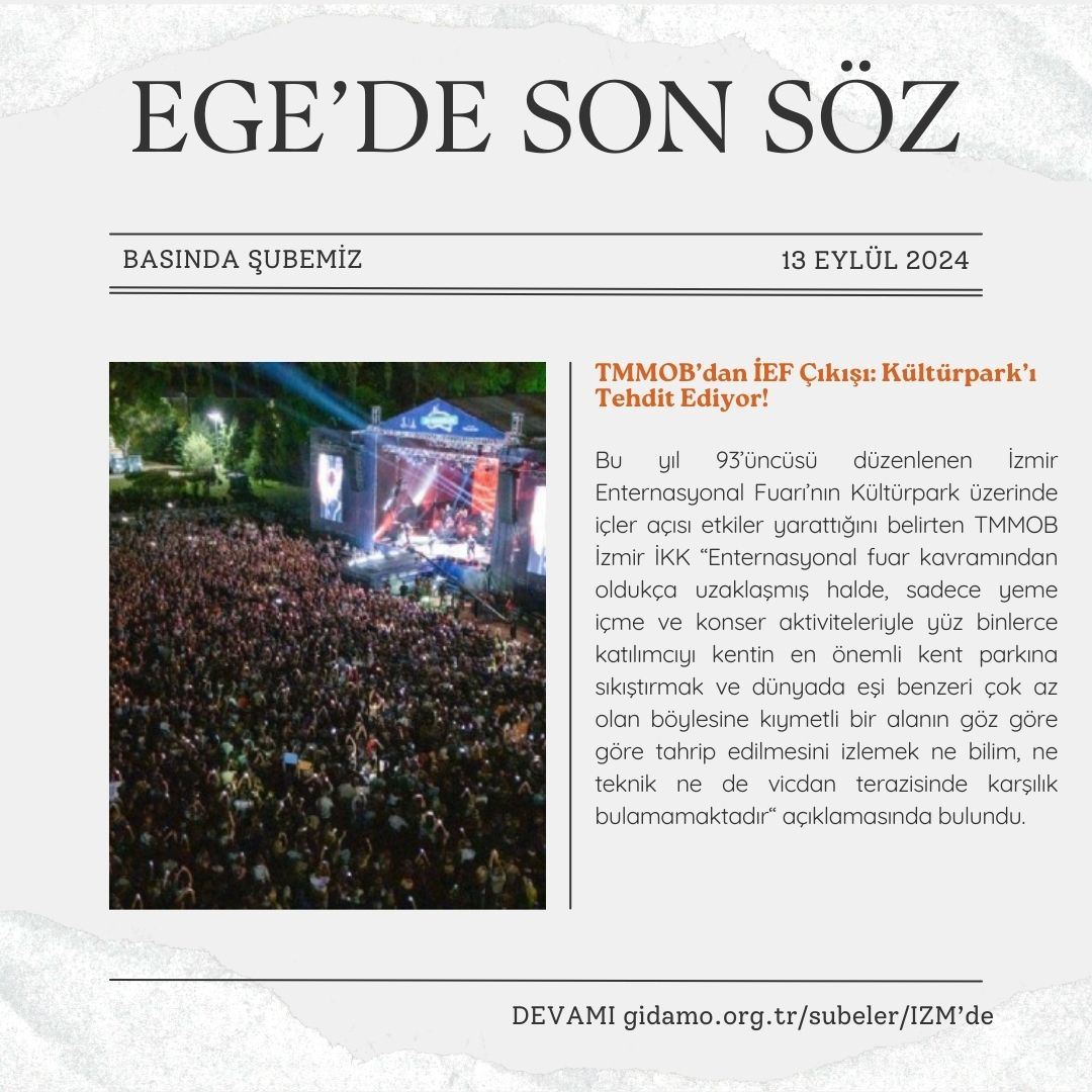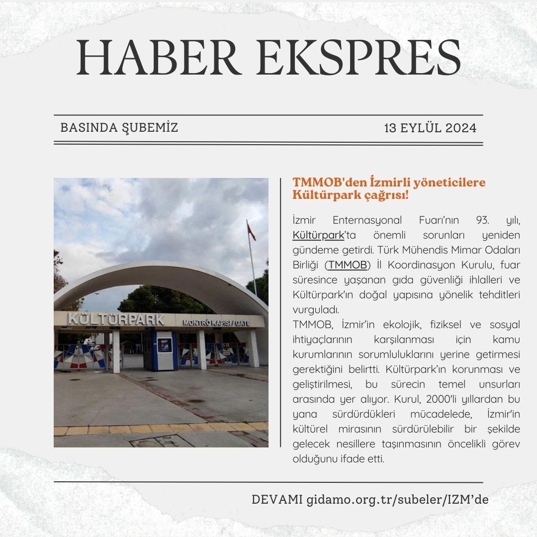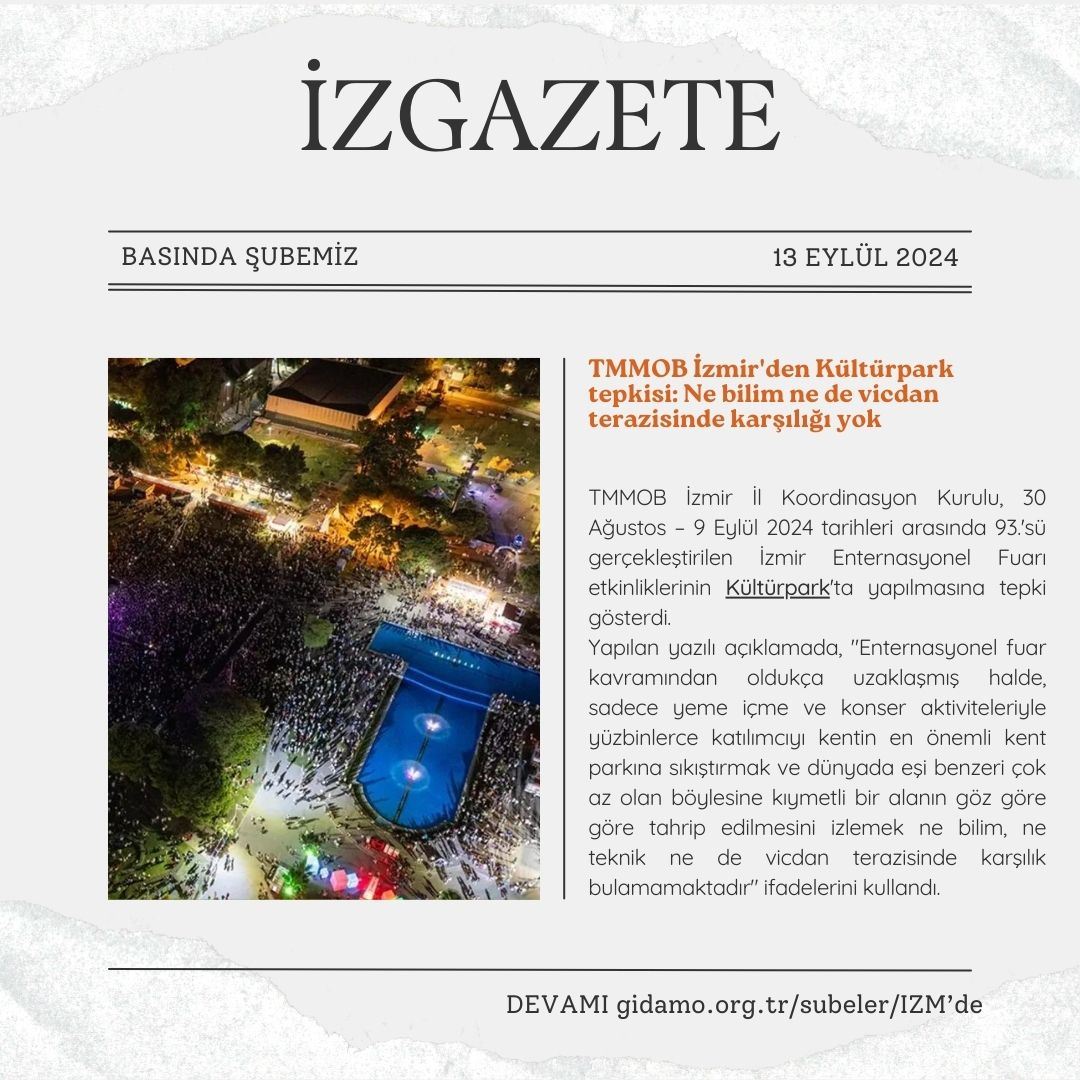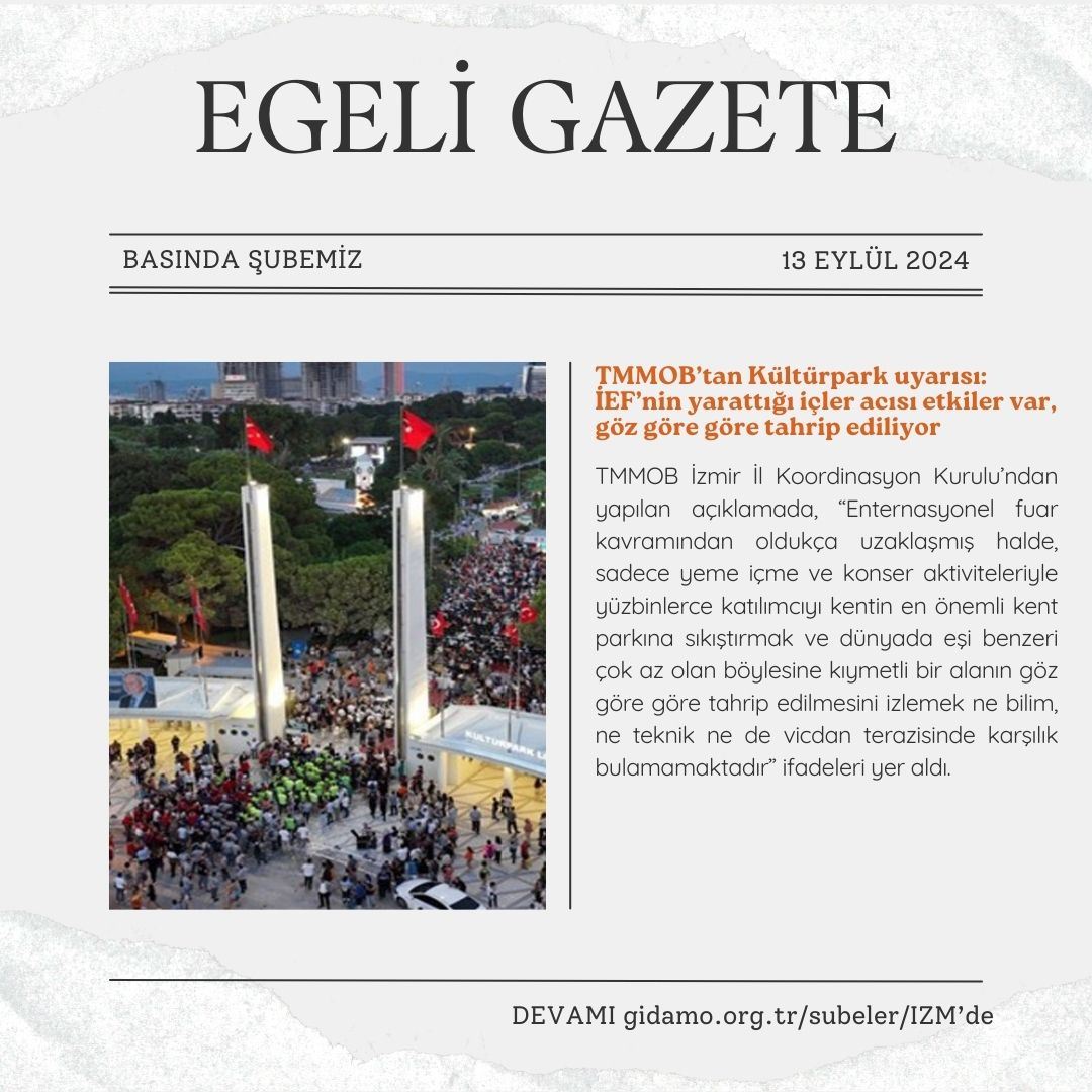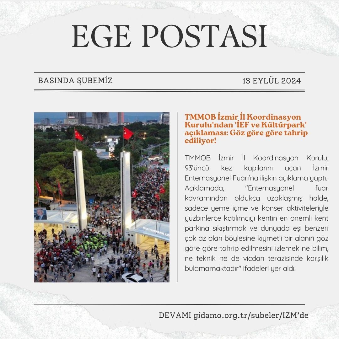 TMMOB İzmir İl Koordinasyon Kurulu tarafından 93. İzmir Enternasyonal Fuarı ve Kültürpark hakkında bir basın açıklaması yapıldı.