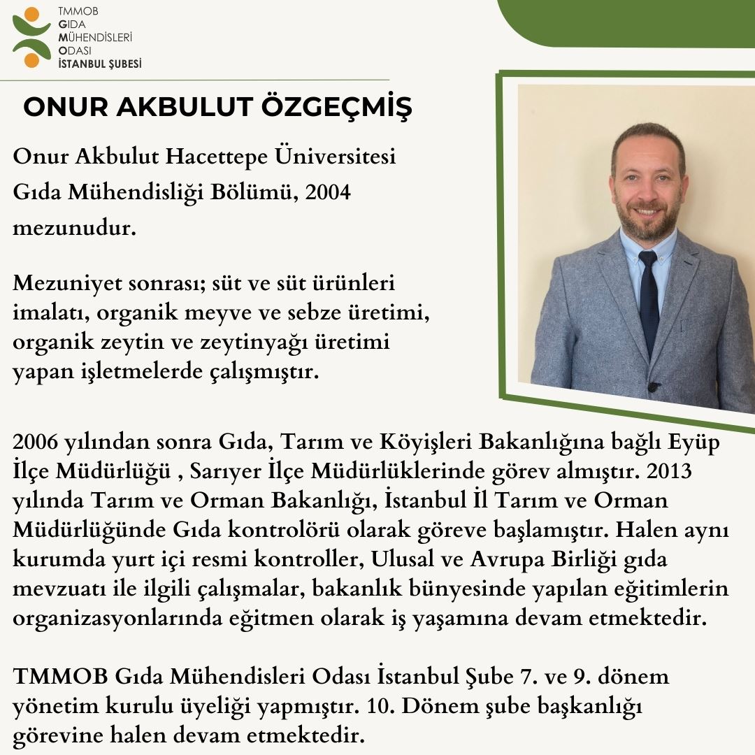 Gıda Yüksek Mühendisi Onur AKBULUT / TMMOB GıdaMO İstanbul Şube Yönetim Kurulu Başkanı - Tarım ve Orman Bakanlığı İstanbul İl Müdürlüğü