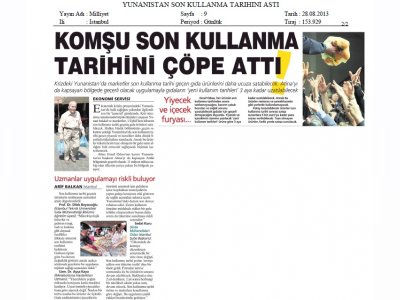 Yunanistanda yaşanan krizi hafifletmek adına marketlerde satışa sunulan yiyecelerin son kullanma tarihleri geçse dahi belirli sürelere kadar satışa sunulmasına izin verildi. Konuyla ilgili olarak TMMOB Gıda Mühendisleri Odası İstanbul Şube Başkanımız Sayın Sedat KURUnun verdiği demeç 28.08.2013 tarihli Milliyet Gazetesinde yer almıştır.