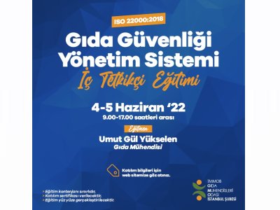 TMMOB Gıda Mühendisleri Odası İstanbul Şubesi`nde 04-05 Haziran 2022 Cumartesi- Pazar günleri gerçekleştirilecek olan iki günlük "Gıda Güvenliği Yönetim Sistemi (ISO 22000:2018) İç Tetkikçi Eğitimi" hakkında ayrıntılar aşağıda verilmiştir. Tüm üyelerimizin bilgisine sunulur.